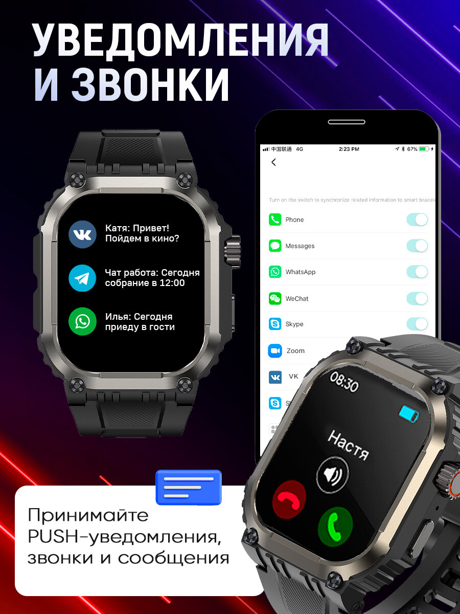 - Поддержка звонков по Bluetooth: Возможность отвечать и совершать звонки прямо с часов благодаря встроенному микрофону и динамику, как в смарт часах с BT звонком.