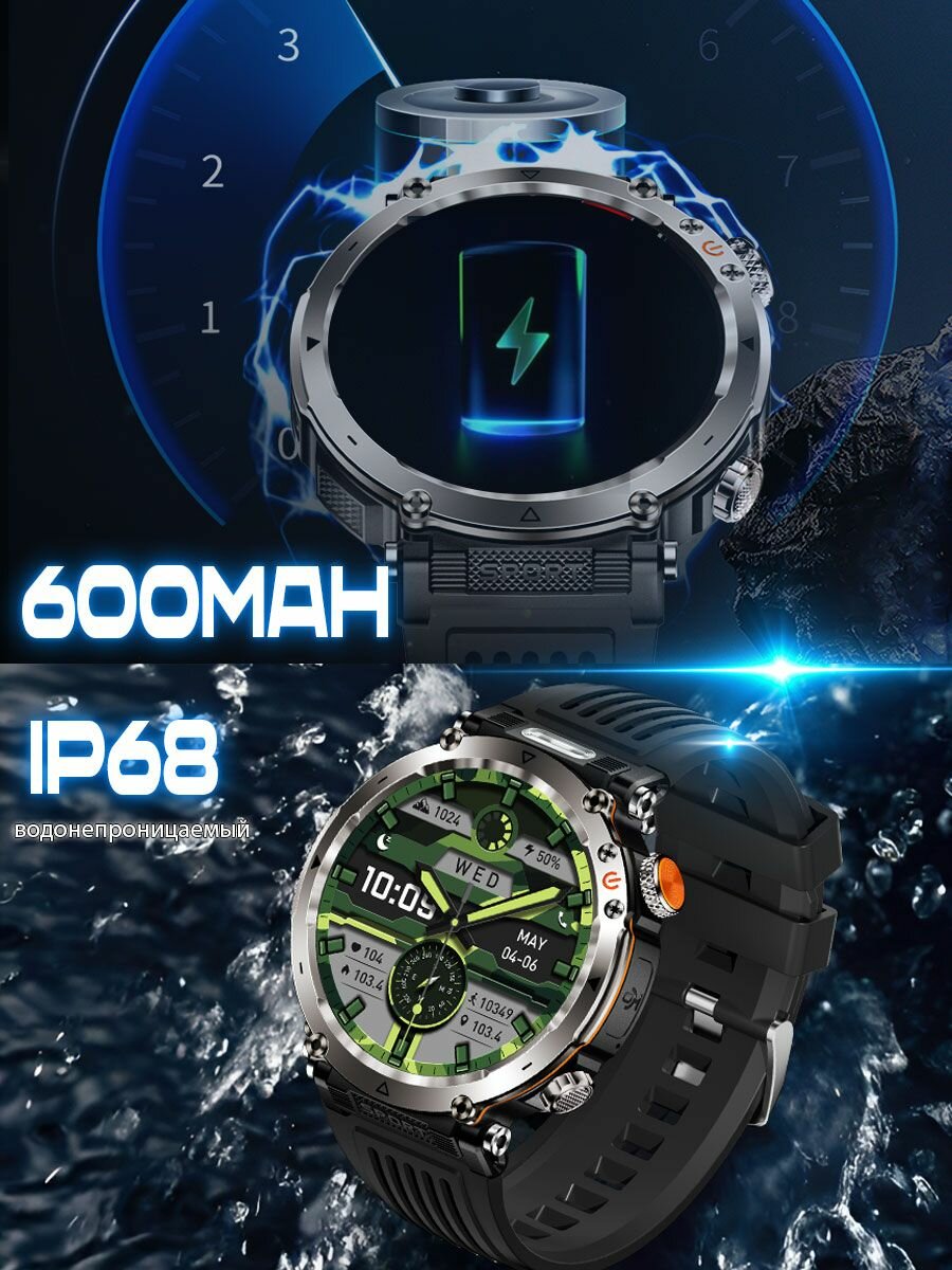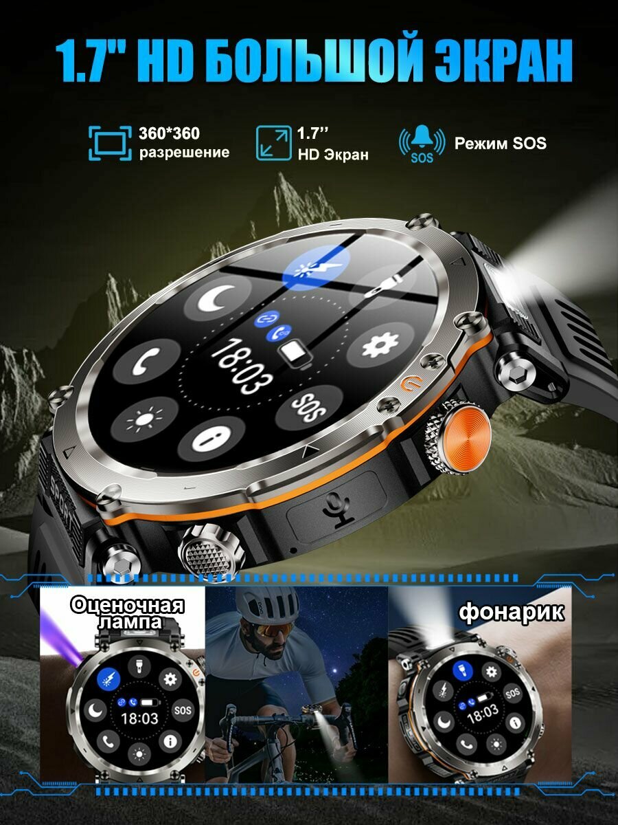 Купить Смарт часы мужские с 1.7’большим amoled экраном, С фонариком лазерный свет, компас, фитнес трекер, bluetooth звонки с доставкой по всей России.