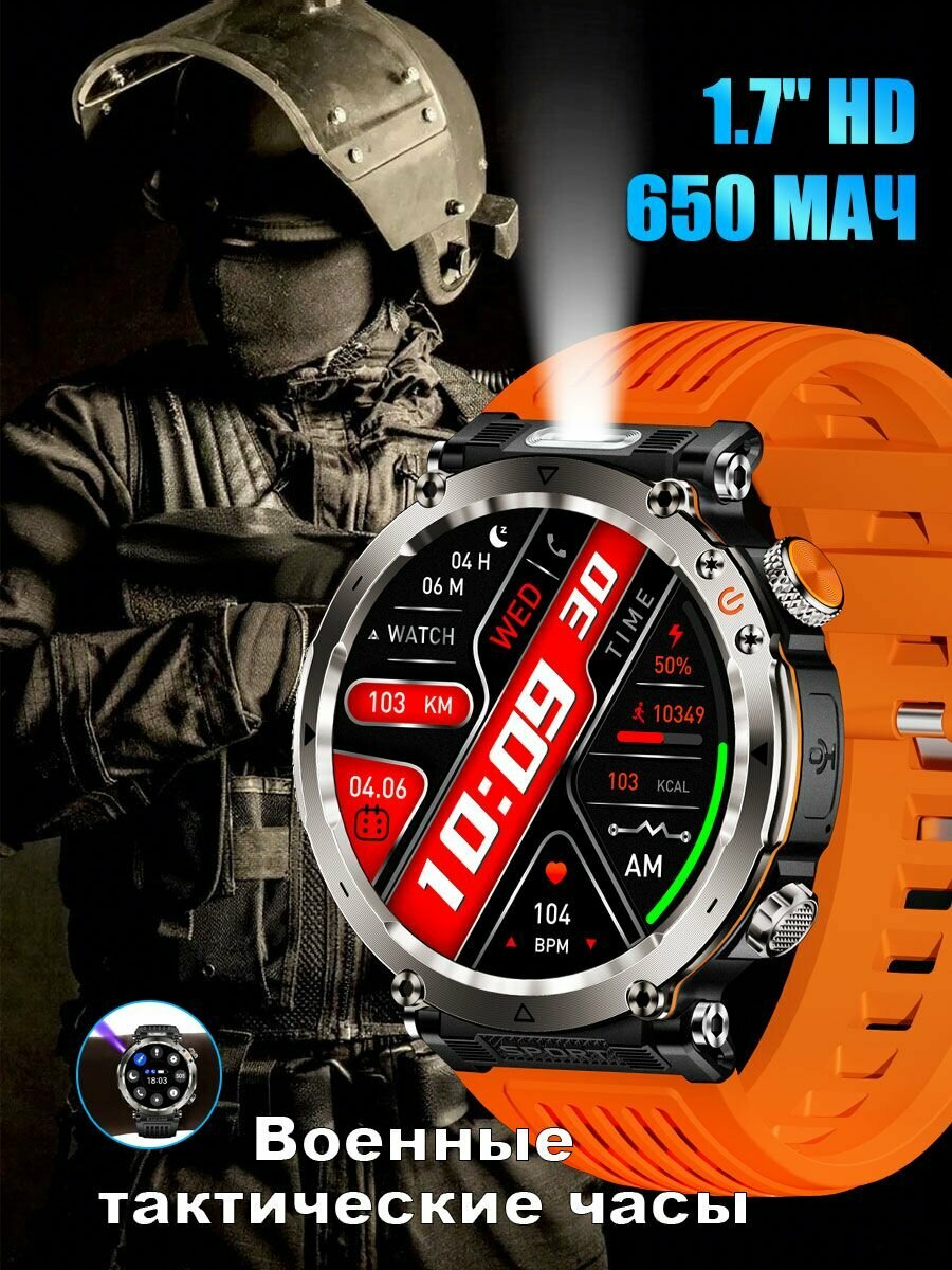 Смарт часы мужские с 1.7’большим amoled экраном, С фонариком лазерный свет, компас, фитнес трекер, bluetooth звонки