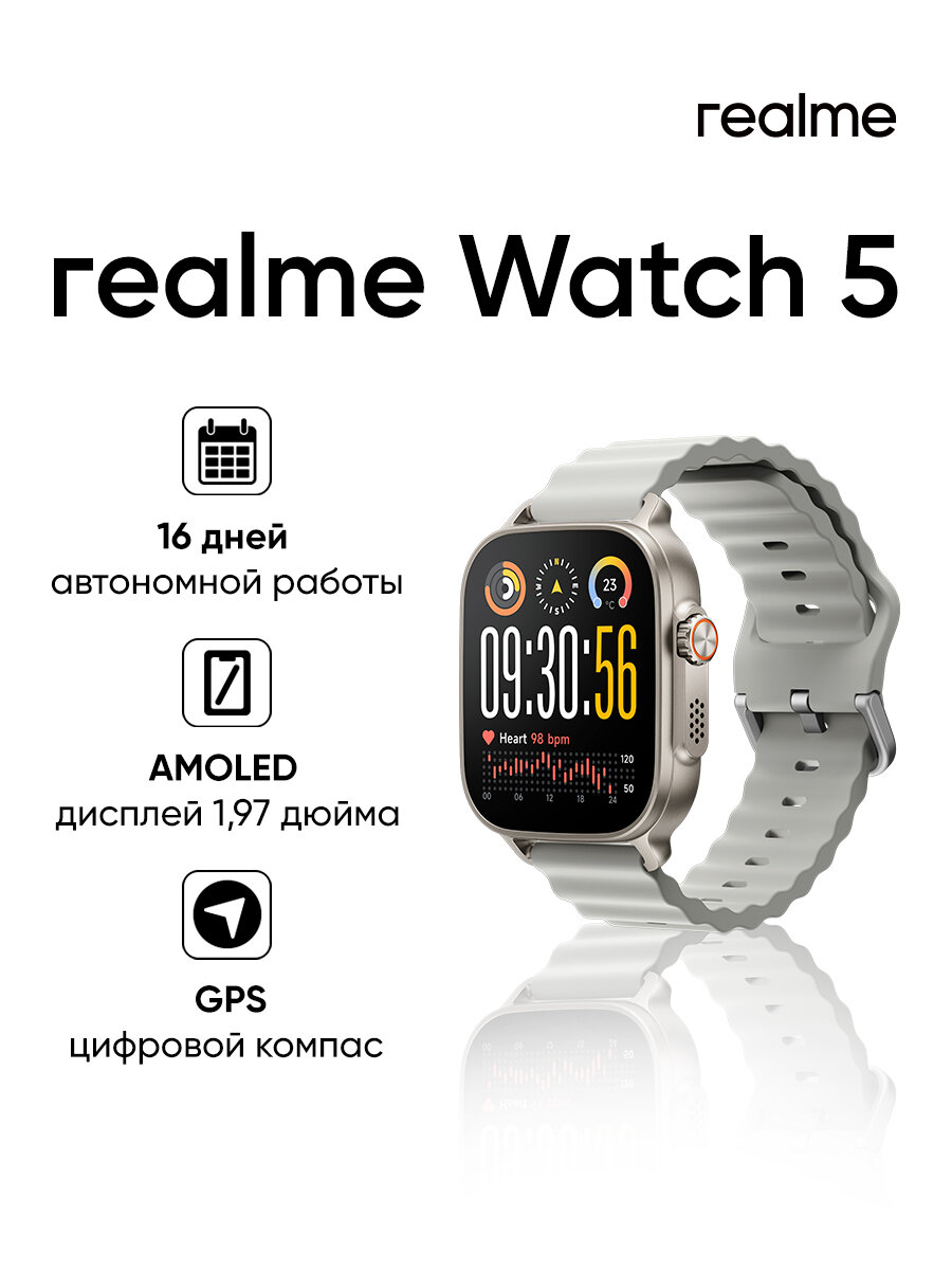 Смарт-часы realme Watch 5 RMW2501, GPS, NFC, IP68, AMOLED, Серебристый: сравнение цен, характеристики, фото, актуальное наличие и цены.