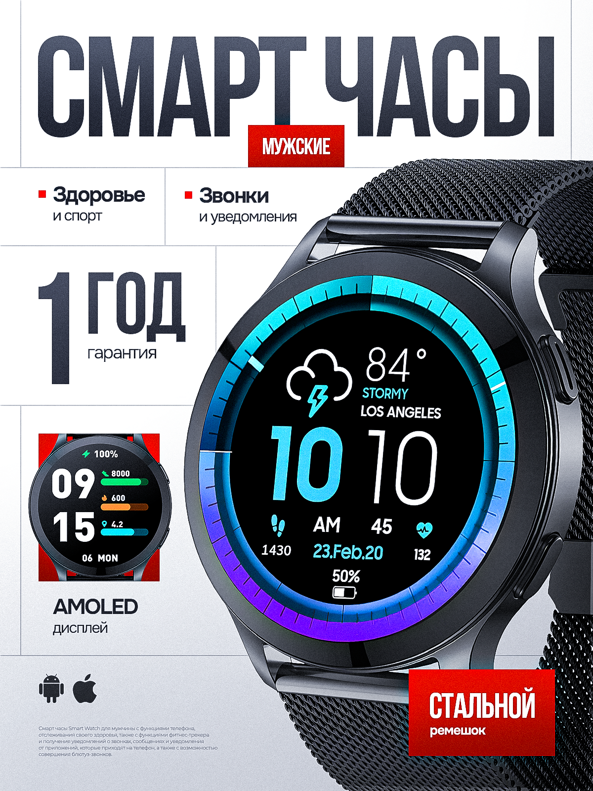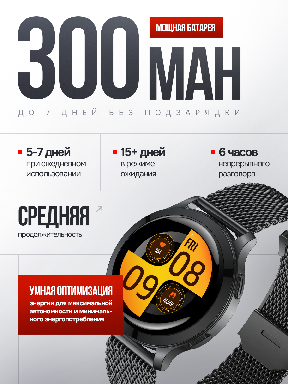 воспроизведение аудио, магнитная зарядка, поиск смартфона, поиск часов, фонарик