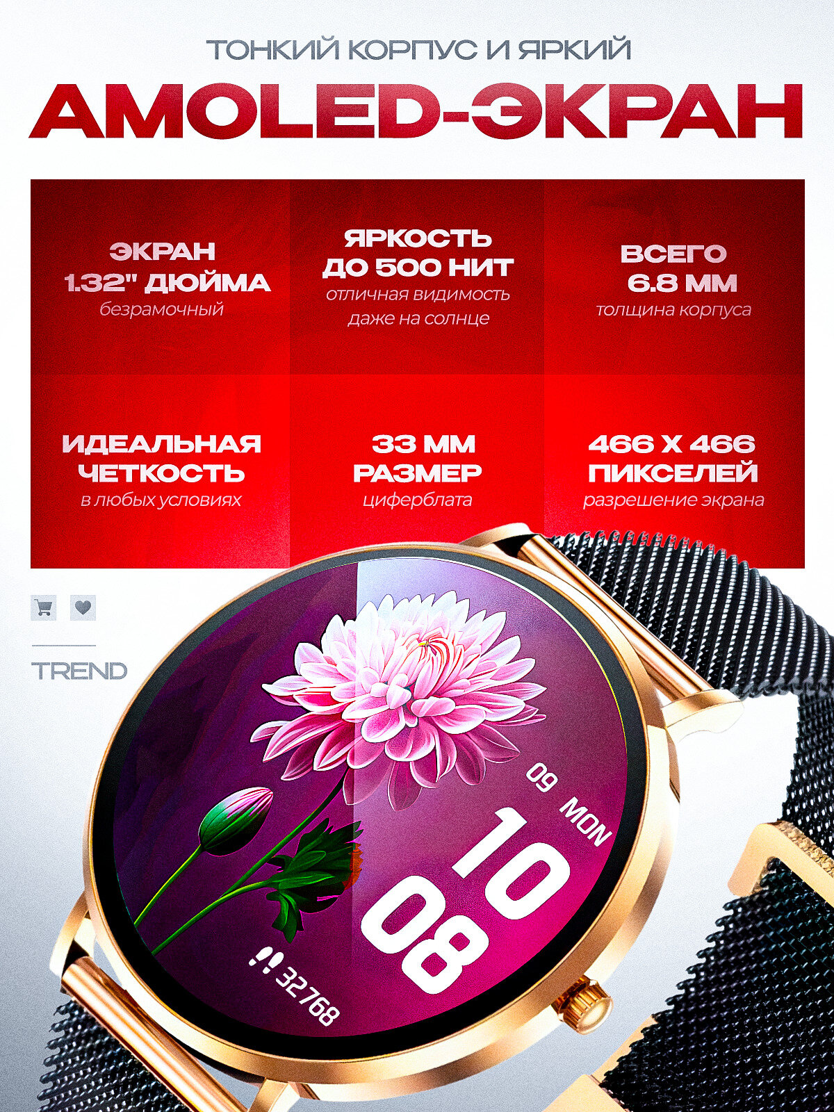 Модель умных часов сочетает в себе современный и деликатный дизайн, сочетающий в себе практичность и легкость. Толщина корпуса всего 6.8 мм.