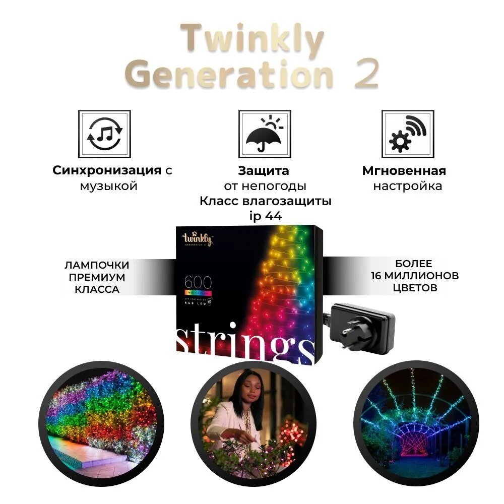 TWS600STP ― это одна из самых больших смарт-гирлянд от бренда Twinkly. Модель состоит из 600 светодиодов, а её освещаемая длина ― целых 48 метров. Управление гирляндой осуществляется только беспроводным образом, по Bluetooth или Wi-Fi.