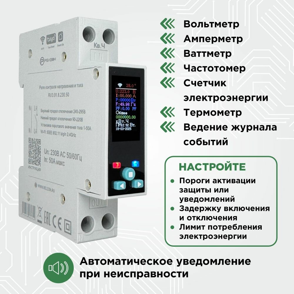 Смарт реле контроля напряжения и тока Wi-Fi, Tuya, 1НО 50А (230В AC), релеон, RV3.01.8.230.50: сравнение цен, характеристики, фото, актуальное наличие и цены.