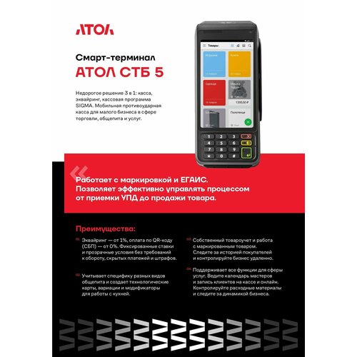 Если вам нужна надежная онлайн касса для малого бизнеса, которая поможет повысить эффективность работы и улучшить обслуживание клиентов, смарт-терминал АТОЛ СТБ 5 - это ваш лучший выбор.