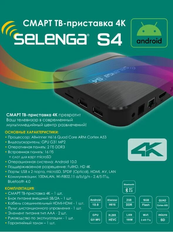 Купить Smart-TV приставка 4К Selenga S4. с доставкой по всей России. Smart-TV приставка 4К Selenga S4.: сравнение цен, характеристики, фото, актуальное наличие и цены.