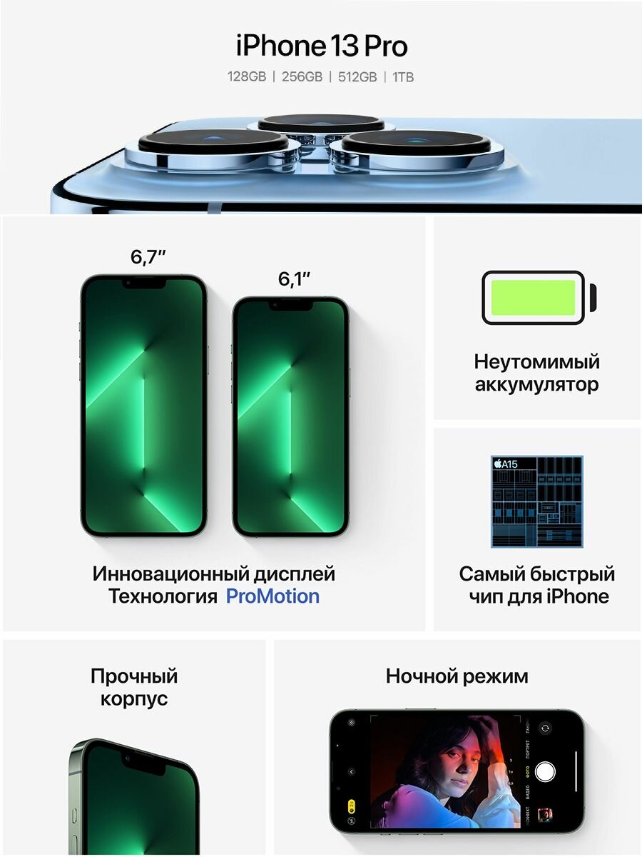 Дисплей Super Retina XDR с технологией ProMotion и быстрым, плавным откликом. Грандиозный апгрейд системы камер, открывающий совершенно новые возможности. Исключительная прочность. A15 Bionic — самый быстрый чип для iPhone. И впечатляющее время работы без подзарядки. Всё это Pro. Хирургическая нержавеющая сталь, панель Ceramic Shield, надёжная защита от воды (IP68) — всё это невероятно красиво и исключительно прочно. Встречайте дисплей Super Retina XDR с технологией ProMotion. У него адаптивная частота обновления до 120 Гц и великолепная графическая производительность — прикоснитесь и удивитесь.