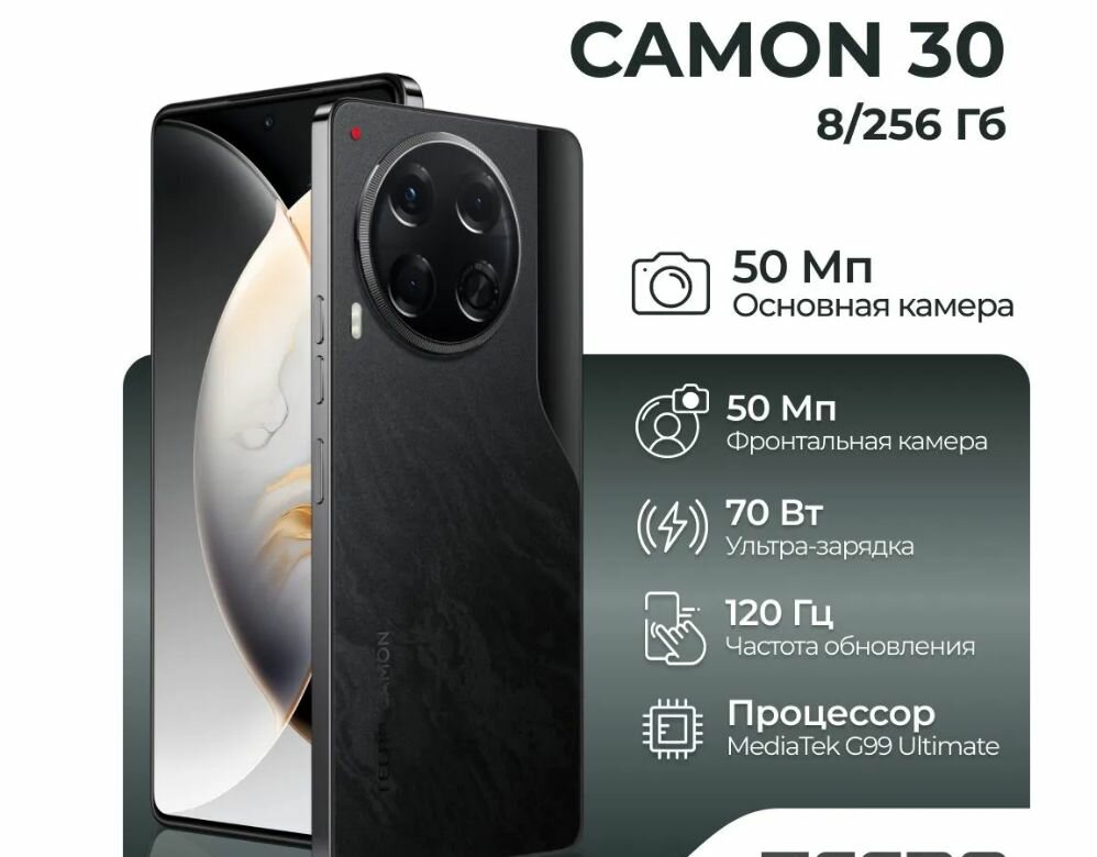 6.78" Смартфон Tecno CAMON 30S Pro [8 ядер (2.2 ГГц), 2SIM, AMOLED, 2436x1080, 120Гц, камера 50Мп+2Мп+AI камера, селфи-камера 50Мп, NFC, 4G, GPS, FM, IrDa, 5000мАч]Первый смартфон TECNO с беспроводной зарядкой и изогнутым AMOLED-экраном. Отличные возможности для съемки фото и видео высокого качества по доступной стоимости. - Основная камера 50 Мп с оптической стабилизацией OIS и режимом съемки высокой четкости 100 Мп - Широкая площадь 1/1.56" светочувствительного сенсора Sony IMX896 - Изогнутый AMOLED-экран частотой обновления 120 Гц, защищен стеклом Corning Gorilla Glass 5 - Новый формат для съемки контента с соотношением сторон 16:9 Съемка высокой четкости 100 Мп Смартфон оснащен камерой 50 Мп со светочувствительным сенсором флагманского уровня 1/1.56" Sony IMX896 и оптической стабилизацией OIS, что обеспечивает ультрачеткое качество снимков, в том числе за счет режима съемки высокой четкости 100 Мп. Относительно остальных камер, TECNO CAMON 30S Pro получил характеристики как у младших моделей серии CAMON 30, а также функции ИИ. Погружение в безграничный контент Изогнутый AMOLED-дисплей диагональю 6,8” c частотой обновления 120 Гц обеспечивает ощущение безрамочного экрана, а стереодинамики с поддержкой Dolby Atmos погружают в глубокое и сбалансированное звучание. Улучшенная производительность Новый процессор дополнен большим объемом постоянной и оперативной памяти для эффективной работы над любыми задачами. - Восьмиядерный процессор MediaTek G100 - Постоянная память 256 Гб - Оперативная память 8 Гб с возможностью виртуального разрешения +8 Гб Новые возможности для подзарядки Энергоемкий аккумулятор смартфона 5000 мАч, способен продержаться целый день на одном заряде, но если случилось так, что нужно пополнить батарею, то в комплекте имеется быстрая зарядка мощностью 45 Вт. Помимо того, TECNO CAMON 30S Pro поддерживает беспроводную зарядку мощностью до 20 Вт. Эргономичный и трендовый дизайн Смартфон подходит для тех, кто ищет компактный и стильный девайс. Тонкий изящный корпус TECNO Camon 30S Pro симметрично изогнут как со стороны экрана, так и со стороны задней крышки. Оформление задней панели напоминает фотографию звездного неба, сделанную на долгой выдержке. Модель производится в трех вариантах: “Звездный серый”, “Жемчужное золото” (экокожа) и “Зеленый хамелеон” (Sunlight Drawing, меняет цвет под воздействием УФ-лучей c мятного на изумрудно-зеленый).