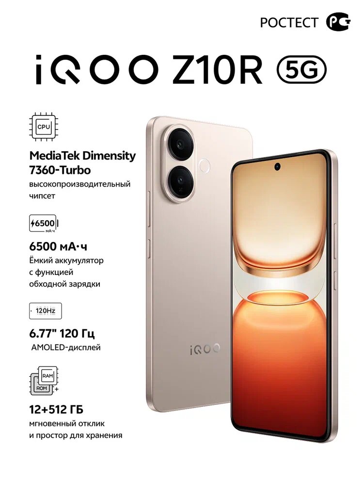 Смартфон iQOO Z10R 12+512 ГБ, AMOLED, 6500 мАч, стереодинамики, золотой: сравнение цен, характеристики, фото, актуальное наличие и цены.