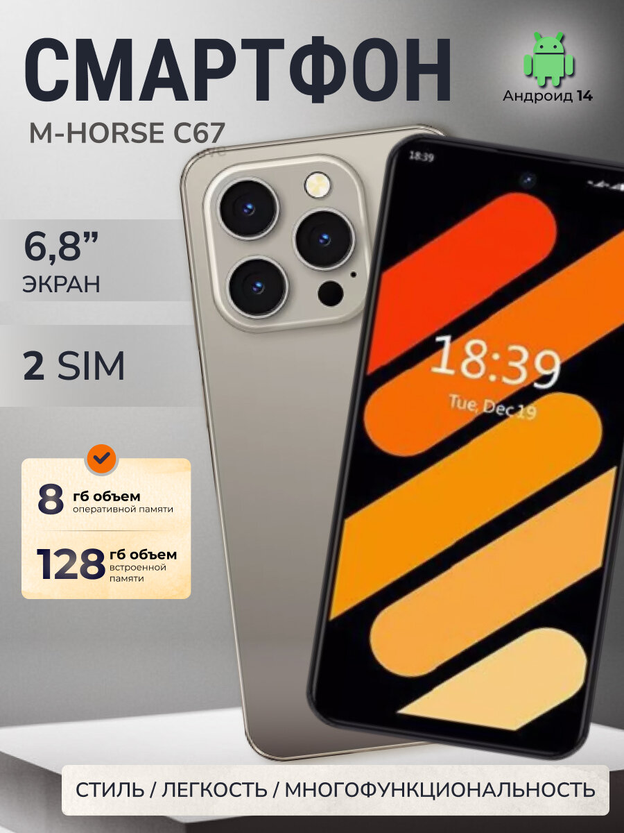 Смартфон андроид M-Horse C67 имеет 2 SIM карты, встроенную память 128 ГБ, фронтальную камеру 5 Мп, основную камера 13 Мп, оперативную память 8 ГБ(3+5 Гб). Сотовый телефон с двумя сим картами имеет процессор 8 ядер, 1,6 Ггц и разъем Type-C. Представлен в четырех цветах. Поддерживает: звонки, видеозвонки, сообщения, будильник, часы, игры, вибрация и множество других программ, позволяет сохранять контакты. Размеры 16,6 х 7 х 0,8 см. Сенсорный телефон продается полностью укомплектованный: блок питания, провод type-c, коробка, телефон, пленка на экран, силиконовый чехол, сим открывашка. Мобильный телефон с Bluetooth и русской клавиатурой, хорошим громким динамиком и аккумулятором 5000 мАч. Отлично подойдет как для взрослого так и для ребенка. Станет отличным подарком на день рождения для девочки и мальчика. Полноценный рабочий на операционной системе Android 14.0 позволяет скачивать любые приложения. M-Horse C67 твой надежный помощник с 6,8” экраном и разрешением 1640х720 пикселей. Наслаждайтесь плавными анимациями при потреблении контента благодаря экрану с частотой обновления 90 Гц. Мощное и стильное устройство, предназначенное для тех, кто ценит качество и функциональность.