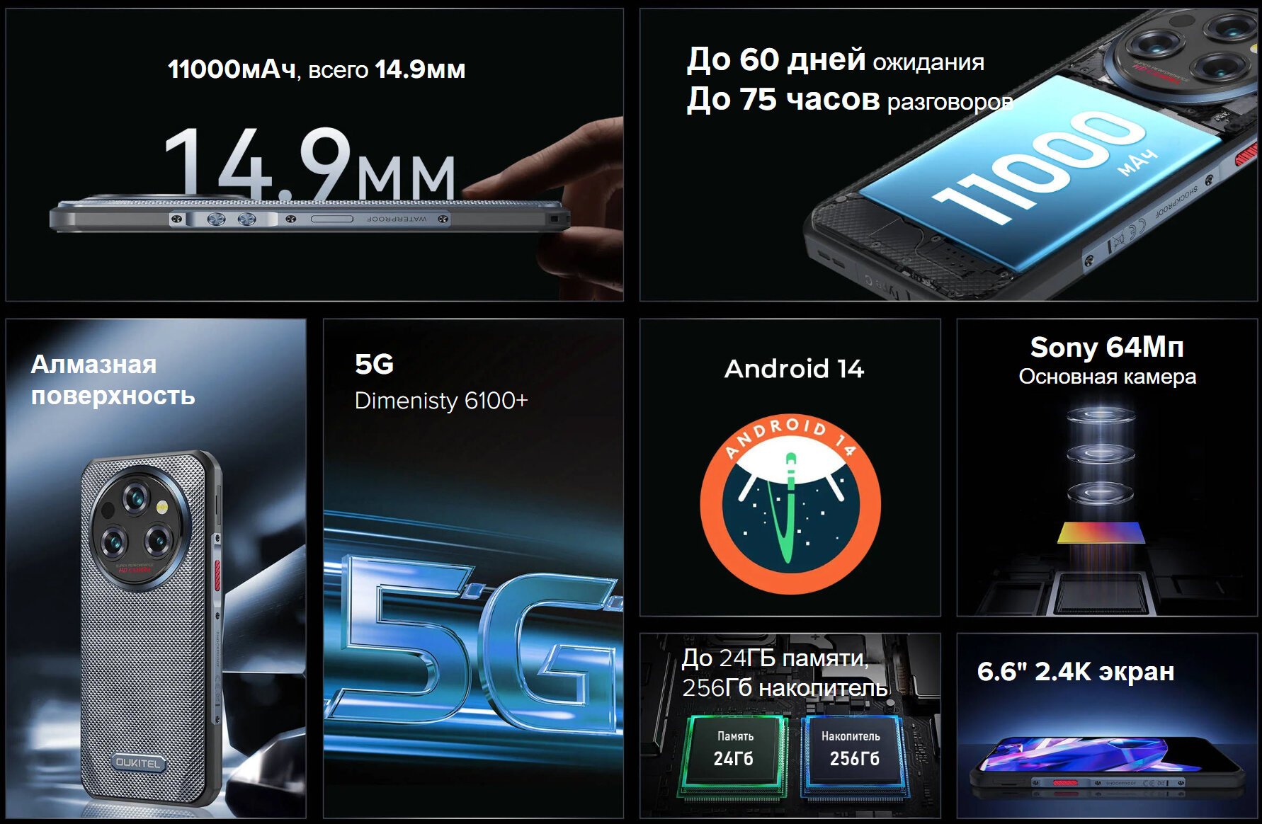 Глобальная версия Oukitel WP35 5G прочный смартфон Android 14 6,6 дюйма 2,4K 24 ГБ + 256 ГБ мобильный телефон 11000 мАч 64 МП сотовый телефон NFC