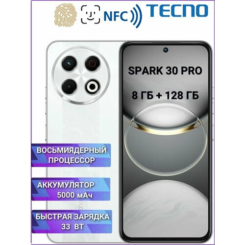 TECNO SPARK 30 ProМеняйся со SPARKФлагман серии надежных и сбалансированных смартфонов TECNO Spark 30 Pro создан для тех, кому важны продвинутые характеристики по доступной цене. Отличный компаньон для съемки и просмотра контента. Высокая производительность. Новый процессор 8 gen2 обеспечивает отличную производительность. Благодаря новому чипсету, поддерживается связь уровня 4.5G (LTE+, LTE Advanced). До 100% более быстрое соединение, по сравнению с 4G, а скорость загрузки может достигать 300 Мбит/с по данным тестирования TECNO Lab. Смартфон обладает большим объёмом памяти, что позволяет без труда сохранять все важные приложения, фото, видео и другие данные. Доступны различные варианты размера хранилища данных:● 256 ГБ + 8 ГБ (+ расширение на 8 ГБ)● 128 ГБ + 8 ГБ (+ расширение на 8 ГБ)Также есть слот для карты памяти microSD до 1 ТБ. Быстрая зарядка 33 Вт с лёгкостью пополнит энергию смартфона в короткие сроки, также можно выбрать режим скорости зарядки. Надёжный аккумулятор 5000 мАч, который остаётся как новый в течение 4 лет. После 1000 циклов зарядки аккумулятор сохраняет более 80% своей первоначальной ёмкостиНовый уровень просмотра контента. Яркий экран с заботой о зрении. AMOLED FHD+ экран с частотой обновления 120 Гц обеспечивает практически бесконечную контрастность, глубокий чёрный цвет и плавную картинку. Пиковая яркость дисплея 1700 нит, точная цветопередача и сертификация экрана TÜV Rheinland обеспечивают комфортную работу без вреда для зрения. 100% DCI-P3 кинематографическое цветовое пространство экрана. Широкая цветовая гамма обеспечивает непревзойденную визуальную точность и реалистичность картинки. Благодаря двойным стереодинамикам звук получается в три раза громче и насыщеннее по сравнению с предыдущими моделями. Технология Dolby Atmos и поддержка Hi-Res Audio позволит вам полностью погрузиться в происходящее на экране. Снимайте каждую деталь. Подсвети каждую деталь. Снимайте чёткие и неповторимые фото даже ночью c основной камерой 108 Мп и светочувствительным сенсором размером 1/1.52”. Вспышка 4 диода. Фронтальная камера 13 Мп с двойной вспышкой и возможностью настройки яркости и температуры, поможет запечатлеть каждую вашу эмоцию. Стильный и надёжный дизайн. TECNO Spark 30 Pro тоньше всех в новой серии Spark 30 - 7.4 мм, и весит всего 188 грамм. Несмотря на внешнюю элегантность, смартфон можно использовать в различных ситуациях, даже если начался небольшой дождь. На экране есть олеофобное покрытие, поэтому смартфоном можно легко управлять даже мокрыми руками. TECNO Spark 30 Pro доступен в трёх цветах: Чёрный Obsidian edge (Обсидиановая грань) и Белый Arctic Glow (Арктическое сияние) с пластиковой поверхностью, а также Зелёный с покрытием из экокожи Magic Skin 3.0.