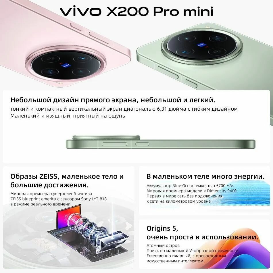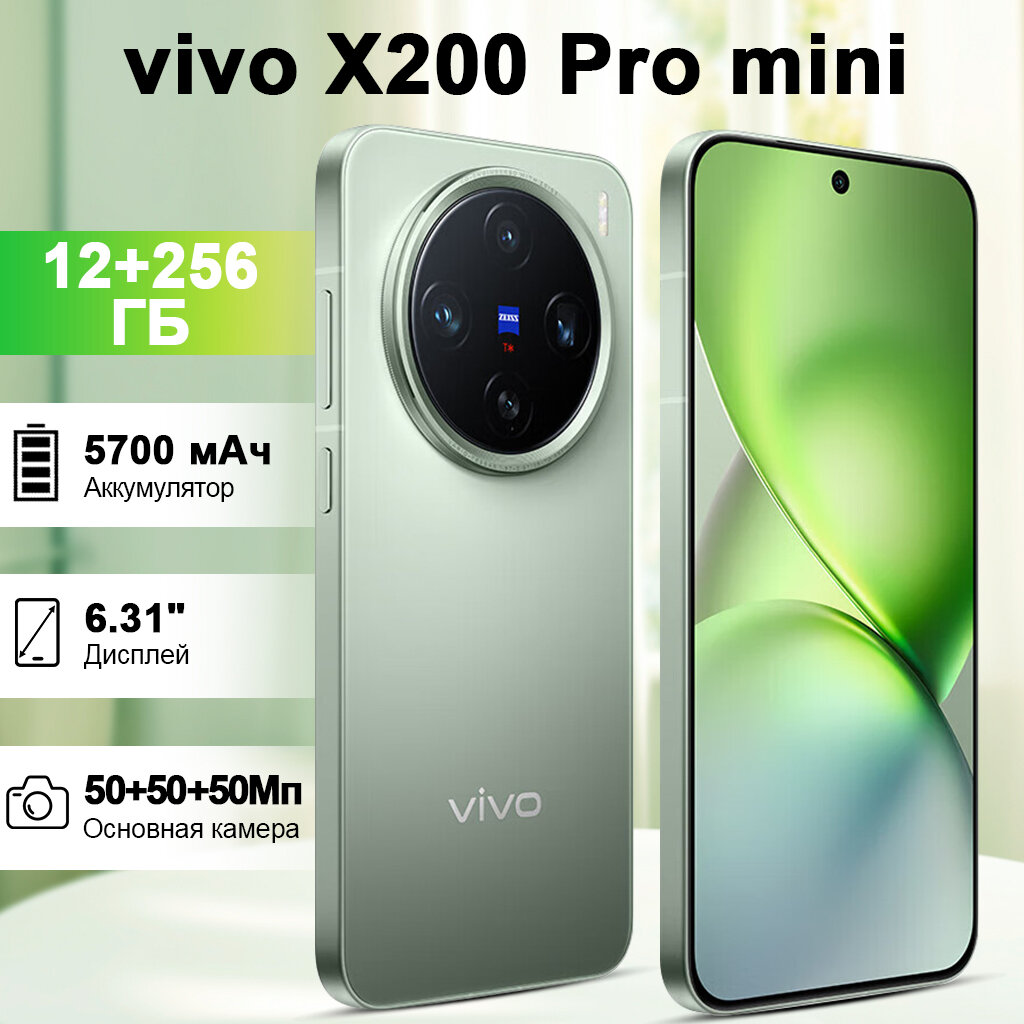 Смартфон Vivo X200 Pro mini 5G NFC 12/256ГБ, Dual nano SIM, MediaTek Dimensity 9400, 8-ядерный процессор, зеленый, CN: сравнение цен, характеристики, фото, актуальное наличие и цены.