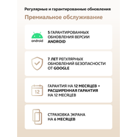 | Гарантийный срок | 1 г., 5 гарантированных обновлений версии ANDROID. 7 лет регулярных обновлений безопасности от GOOGLE. Гарантия на 12 месяцев + расширенная гарантия на 12 месяцев. Страховка экрана на 6 месяцев |