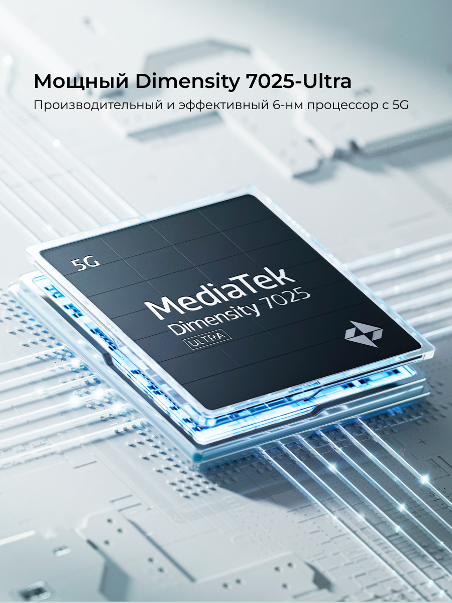 - Процессор: Mediatek Dimensity 7025 Ultra, выполненный по 6-нм техпроцессу, обеспечивающий высокую производительность.