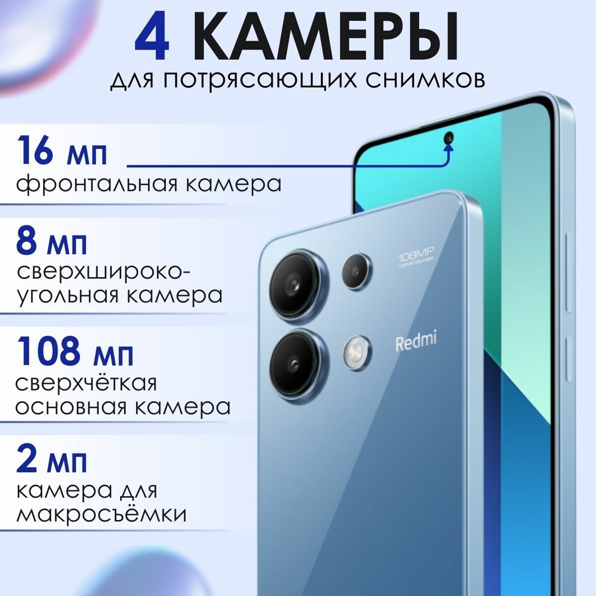 Отдельного внимания заслуживает блок камер с разрешением основной 108 Мп. Она дополнена сверхширокоугольным сенсором и макромодулем на 8 и 2 Мп соответственно. Множество интеллектуальных режимов и трехкратный зум позволят сделать четкие, яркие снимки даже при слабом освещении. Снять динамичные видео кинематографического качества на Xiaomi Redmi Note 13 удастся благодаря встроенным фильтрам и режиму Multiple filmCamera.