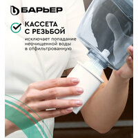 С фильтрами БАРЬЕР вам не придется запоминать размер или диаметр сменной кассеты: любая кассета БАРЬЕР подходит ко всем фильтрам-кувшинам БАРЬЕР. А герметичное резьбовое соединение исключает попадание неочищенной воды в отфильтрованную.