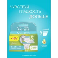 Сменные кассеты для многоразовой женской бритвы Venus Extra Smooth с 5 расположенными в ряд лезвиями дарят максимальную гладкость каждый день. 100% оригинал бренда Venus (Венус). Острые лезвия сменных насадок для женских станков Venus Extra Smooth мягко вытягивают волоски, срезая их ближе к корню. Увлажняющая полоска оригинальной кассеты для станка Venus с маслом авокадо помогает защитить кожу от порезов и царапин, облегчает скольжение бритвы. Любая сменная кассета Extra Smooth Embrace подходит к любой бритвенной ручке Venus (кроме Simply Venus и Venus для бикини). Одна кассета – месяц гладкости при бритье дважды в неделю. Гладкость надолго: каждая сменная кассета с пятью лезвиями обеспечивает безупречную гладкость на длительный срок. Гладкость В одно движение: лезвия с алмазоподобным покрытием обеспечивают мягкое и плавное скольжение бритвы, легко срезая волоски. Масло авокадо: увлажняющая полоска с маслом авокадо увлажняет кожу и помогает защитить ее от раздражения и порезов. В упаковке 4 шт.