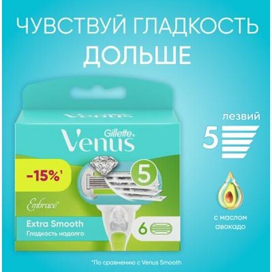 Сменные кассеты для женской бритвы Gillette Venus Embrace, в упаковке 6 шт. Venus Embrace дарит чувство экстрагладкости и комфорта. Gillette Venus Embrace со смазывающей полоской с маслом авокадо обеспечивает идеальную защиту чувствительной кожи. Бритва оснащена 5 острыми лезвиями с алмазоподобным покрытием. Каждое из пяти лезвий мягко вытягивает волосок, срезая его ближе к корню. Преимущества: - 5 долговечных лезвий удаляют волоски ближе к корню. Результат - гладкость длится дольше! - Плавающая головка адаптируется к контурам вашего тела; - Лезвия с алмазоподобным покрытием и смазывающей полоской обеспечивают мягкое и плавное скольжение бритвы, легко срезая волоски; - Увлажняющая полоска с маслом авокадо помогает защитить кожу от раздражения и порезов. Подходят к любой бритвенной ручке Venus, кроме Simply Venus и Venus для зоны бикини. Страна производитель- Польша. Срок годности: 60 месяцев.