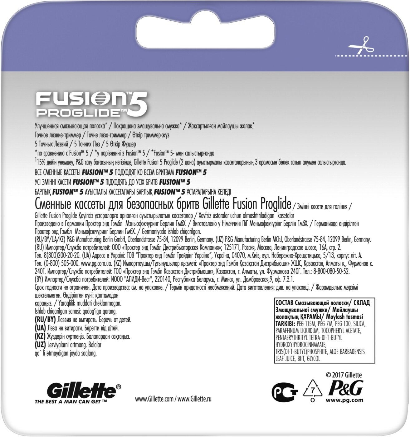 | Состав смазывающей полоски | PEG-115M, PEG-7M, PEG-100, silica, paraffinum liquidum, tocopheryl acetate, pentaerythrityl tetra-di-t-butyl hydroxyhydrocinnamate, tris(di-t-butyl)phosphite, aloe barbadensis leaf juice, BHT, glycol |