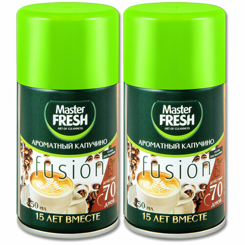 Сменный аэрозоль для автоматического освежителя воздуха MASTER FRESH ароматный капучино 2 штуки по 250 мл. Освежитель воздуха-сменный блок универсальный подходит для всех автоматических диспенсеров. Аромат ароматный капучино окунает нас в страну сладкоежек, где можно почувствовать нежный аромат изысканной дыни, пломбира, яблоневый цвет в одно яркое впечатление. В состав аэрозоля-спрея вошли все те вещества и элементы, которые не способны навредить любому живому существу. Просто вставьте сменный аэрозоль и автоматический спрей будет распылять легкий тонкий, особый аромат. Освежитель воздуха нейтрализует все возможные неприятные запахи, возникающие в жилых и производственных помещениях, хватает на длительный срок использования. Сухое распыление: да. Освежитель воздуха можно использовать: в квартире, в доме, в туалете, в ванной, в гардеробной, в офис, на производстве, в холле, в отеле, на даче.