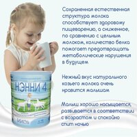 Повышенное по сравнению с более ранними формулами содержание железа в «НЭННИ® 4» важно для профилактики железодефицитных состояний. Количество белка в напитке «НЭННИ® 4» ниже, чем в нативном козьем молоке, что соответствует современным рекомендациям диетологов для детей раннего возраста.