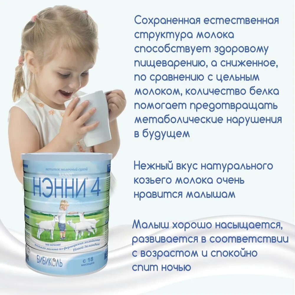 Для нормального роста и развития детей очень важно сбалансированное питание, особенно в период до 3-х лет, когда закладываются основы здоровья. С возрастом меняются вкусовые предпочтения ребенка, он знакомится с новыми продуктами, и не всегда еда «с общего стола» имеет необходимый малышу баланс питательных веществ, витаминов и минералов. Молочный напиток «НЭННИ® 4» создан из натурального цельного козьего молока для дополнительного сбалансированного питания детей старше 1,5 лет в составе разнообразной диеты.