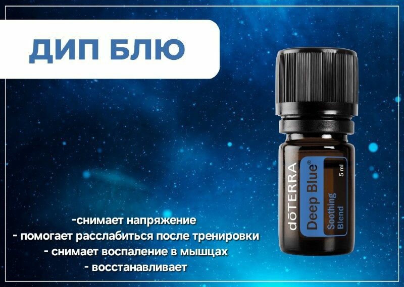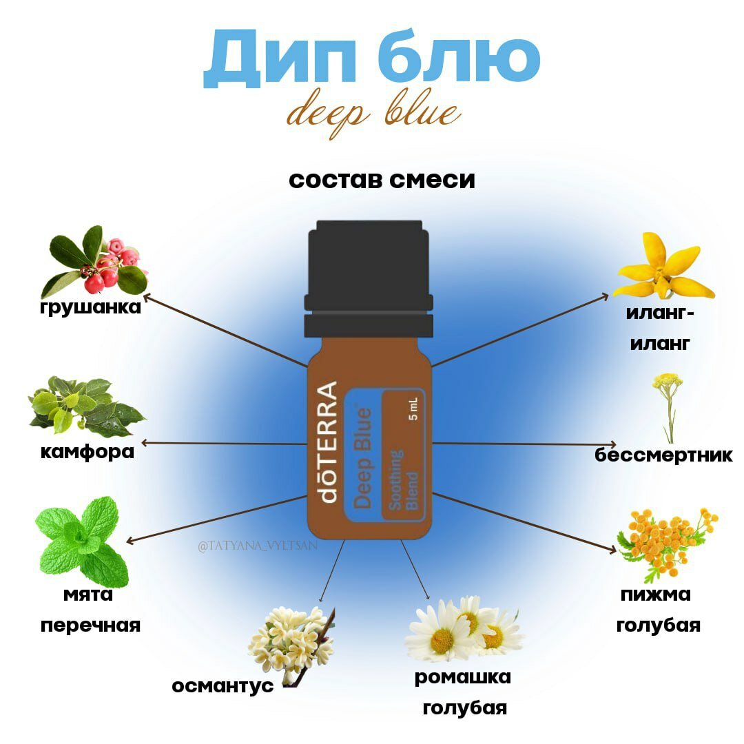 Для охлаждающего и успокаивающего массажа смешайте несколько капель успокаивающей смеси Deep Blue с базовым маслом.