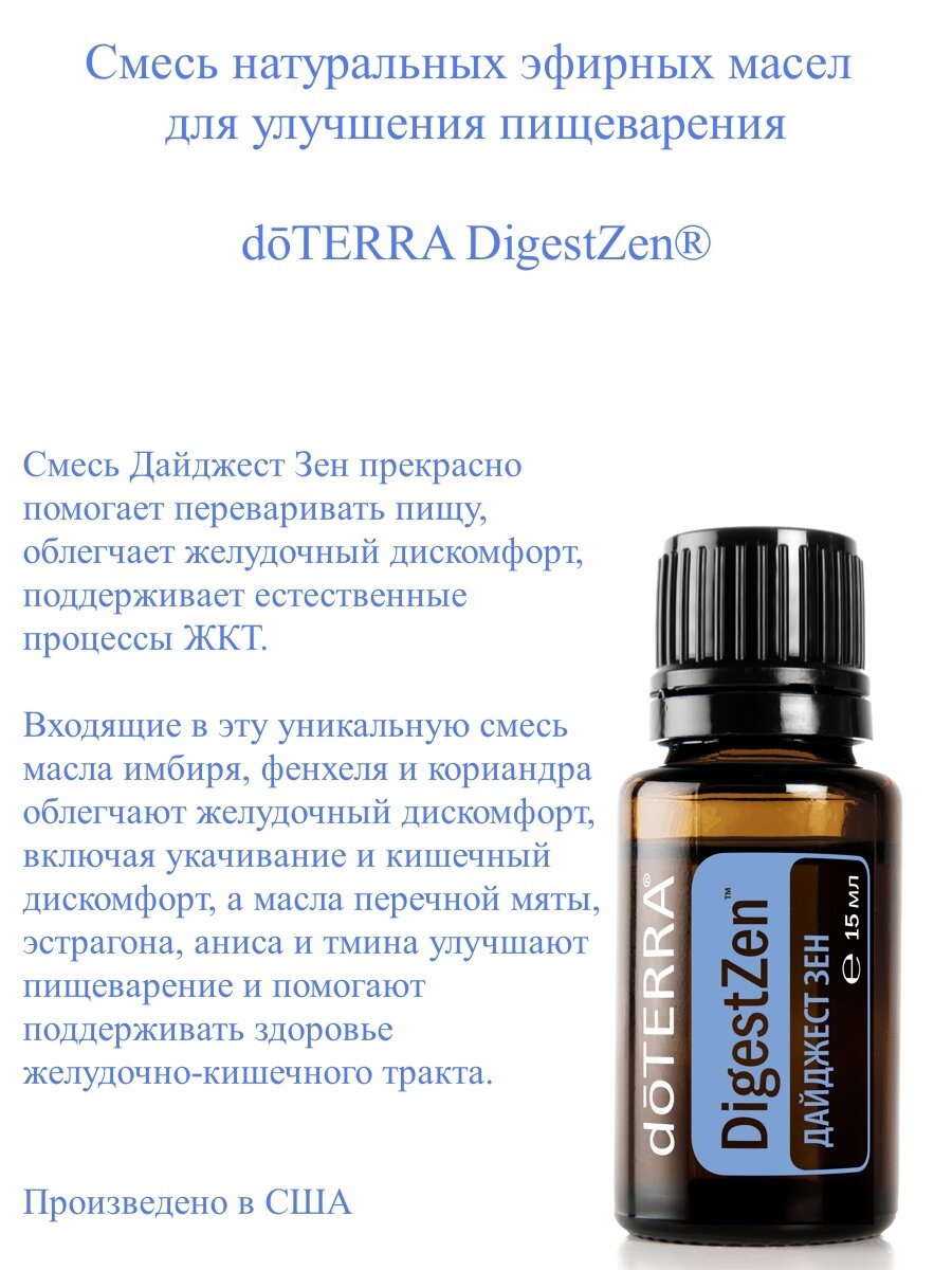 Купить Смесь эфирных масел из США doTERRa DigestZen (Дайджест Зен) для улучшения пищеварения, 5 мл с доставкой по всей России. Смесь эфирных масел из США doTERRa DigestZen (Дайджест Зен) для улучшения пищеварения, 5 мл: сравнение цен, характеристики, фото, актуальное наличие и цены.