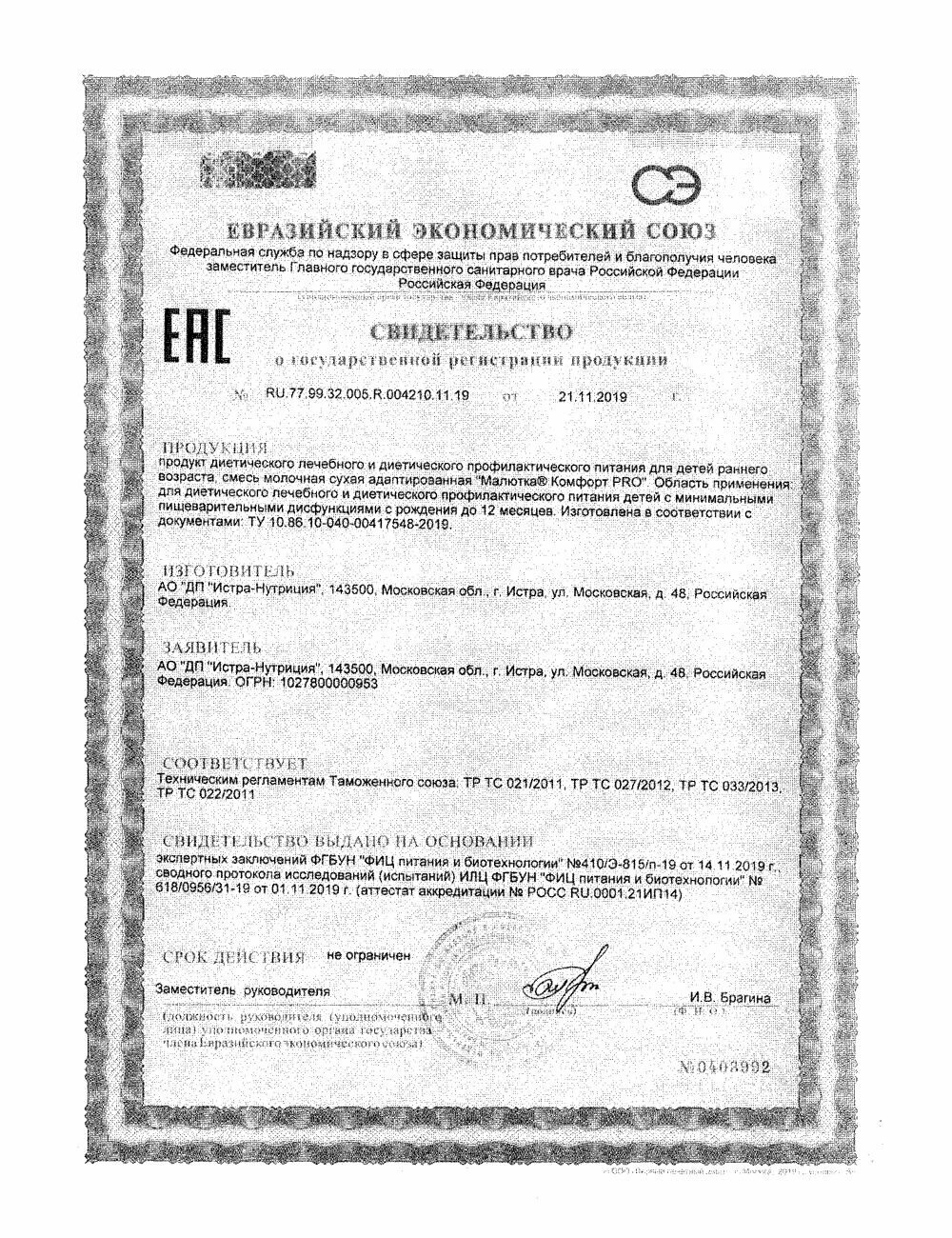 | Состав | сухая молочная основа (деминерализованная молочная сыворотка, смесь растительных масел (пальмовое, рапсовое, кокосовое, высокоолеиновое подсолнечное, подсолнечное, масло из Mortierella alpina, эмульгатор – соевый лецитин), обезжиренное молоко, галактоолигосахариды, лактоза, концентрированная молочная сыворотка, концентрат белков молочной сыворотки, калия хлорид, кальция фосфат, калия цитрат, кальция карбонат, рыбий жир, натрия цитрат, магния хлорид, холина хлорид, натрия гидроксид, L-аскорбат натрия, инозитол, L-триптофан, мальтодекстрин, фолиевая кислота, L-карнитин, ретинола пальмитат, DL-альфа-токоферола ацетат, DL-альфа-токоферол, D-биотин, D-пантотенат кальция, рибофлавин, холекальциферол, фитоменадион), сухая молочная основа (смесь растительных масел (пальмовое, рапсовое, кокосовое, высокоолеиновое подсолнечное, подсолнечное, эмульгатор – соевый лецитин), деминерализованная молочная сыворотка, обезжиренное молоко, лактоза, концентрированная молочная сыворотка, кальция карбонат, кальция фосфат, калия хлорид, магния хлорид, калия цитрат, натрия гидроксид, холина хлорид, L-аскорбат натрия, L-триптофан, мальтодекстрин, фолиевая кислота, ретинола пальмитат, DL-альфа-токоферола ацетат, DL-альфа-токоферол, D-биотин, холекальциферол, фитоменадион), мальтодекстрин, загуститель – камедь рожкового дерева, комплекс витаминно-минеральный (мальтодекстрин, фруктоолигосахариды, L-аскорбиновая кислота, таурин, железа сульфат, цинка сульфат, инозитол, уридин-5-монофосфат, цитидин-5-монофосфат, аденозин-5-монофосфат, инозин-5-монофосфат, никотинамид, гуанозин-5-монофосфат, D-пантотенат кальция, меди сульфат, DL-альфа-токоферола ацетат, тиамина гидрохлорид, пиридоксина гидрохлорид, йодид калия, марганца сульфат, селенит натрия, цианокобаламин). |