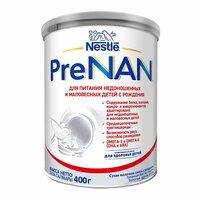 NAN Pre Сухая молочная смесь для недоношенных и маловесных детей с рождения 400 г- сухая специальная молочная смесь на основе частично гидролизированного белка. Предназначена для кормления недоношенных и маловесных детей. Компоненты смеси обеспечивают оптимальное формирование костной ткани и развитие структур мозга и органов зрения ребенка. Заменитель изготовлен без использования генетически модифицированных ингредиентов, консервантов, красителей и ароматизаторов. Продукт изготовлен из сырья, произведенного специально одобренными поставщиками, без использования генетически модифицированных ингредиентов, консервантов, красителей и ароматизаторов. Противопоказания: галактоземия, глюкозо-галактозная непереносимость, аллергия к белкам коровьего молока. Питание для специальных медицинских целей. Не для внутривенного использования. PreNAN® - сухая молочная смесь для питания недоношенных и маловесных детей. Она обеспечит повышенные потребности недоношенного ребенка в питательных веществах, необходимых для быстрого роста и развития. Смесь PreNAN® предназначена для кормления недоношенных и маловесных детей. Смесь для недоношенных и маловесных детей PreNAN®: - благодаря белку высокого качества, адаптированному к потребностям недоношенных детей, смесь легко переваривается и усваивается, обеспечивая оптимальный рост; - Содержит DHA, ARA - специально разработанную смесь ненасыщенных жирных кислот DHA (омега-3) и ARA (омега-6), которая способствует укреплению иммунной системы малыша и важна для развития мозга и зрения; - Сбалансированное соотношение кальция и фосфора обеспечивает оптимальное развитие костной ткани. Сухая молочная смесь PreNAN® имеет 2 возможности разведения: на 70 и 80 ккал на 100 мл. Важное примечание Идеальной пищей для грудного ребенка является молоко матери. Грудное вскармливание должно продолжаться как можно дольше. Перед тем как принять решение об искусственном вскармливании с использованием детской смеси, обратитесь за советом к медицинскому работнику. Возрастные ограничения указаны на упаковке товаров в соответствии с законодательством РФ. Питание для специальных медицинских целей только по назначению и под наблюдением врача. Не для внутривенного использования. Противопоказания: галактоземия, глюкозо-галактозная непереносимость, аллергия к белкам коровьего молока. Продукт изготовлен из сырья, произведенного специально отобранными поставщиками, без использования генетически модифицированных ингредиентов, консервантов, красителей и ароматизаторов. Примечание: для приготовления смеси необходимо использовать только мерную ложку, находящуюся в банке, заполненную без горки. Разведение неправильного количества порошка - большего или меньшего по сравнению с количеством, указанным в таблице - может привести к обезвоживанию организма ребенка или нарушению его питания. Указанные пропорции нельзя изменять без назначения врача. Необходима консультация специалиста. Состав: вода, мальтодекстрин, растительные масла (среднецепочечные триглицериды, низкоэруковое рапсовое масло, пальмовый олеин, подсолнечное масло, подсолнечное высокоолеиновое масло, масло из Криптокодиниум кохнии, масло из Мортиереллы Альпины), лактоза, частично гидролизованный белок молочной сыворотки, регулятор кислотности фосфорная кислот