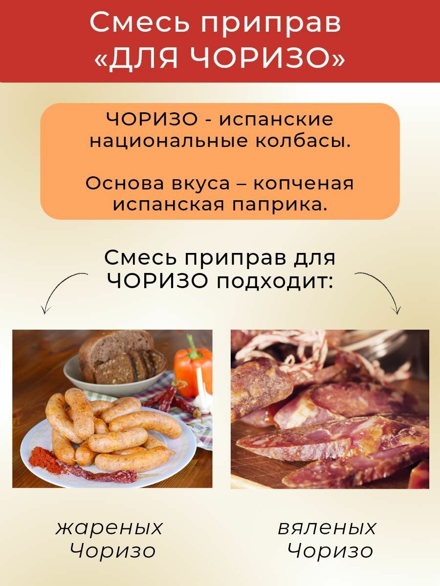 Чоризо - свиная колбаса родом из Испании. Эта домашняя колбаса готовится в натуральной оболочке, например, свиные кишки или говяжьи черева. Основной специей в приготовлении этой вяленой колбасы является копченая паприка. Молотая приправа прекрасно раскрывается в сервелатах, салями, колбасках гриль и копченых колбасах. Эта пищевая добавка собирается только из натуральных специй свежего помола. Пряная смесь приправ острая. В составе этого набора специй: копченая паприка молотая (производство Испания), перец, орегано, чеснок сушеный молотый. Норма внесения 25.37 гр на 1 кг мясного сырья.