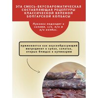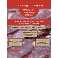 Рекомендуемая дозировка: 10 грамм на 1 кг мясного сырья. Назначение: как вкусоароматическая составляющая рецептур классической вяленой болгарской колбасы Луканка, в других видах салями, сырокопченых, полукопченых, варено-копченых колбас и мясопродуктов. Может применяться как вкусообразующий ингредиент в супах, салатах, вторых блюдах в кулинарии. Внешний вид: порошкообразная сыпучая масса с наличием отдельных легко рассыпающихся комочков, без посторонних примесей; Цвет: от светло-серого до темно-серого с включениями частиц молотых пряностей различных оттенков; Запах: запах свойственный натуральным пряностям; Вкус: пряный, жгучий, сладковатый, свойственный рецептурному составу компонентов смеси, без постороннего; Консистенция: сыпучая. Допускаются комочки, рассыпающиеся при легком нажатии. ***Рецепт*** Сырье: Лопатка свиная – 1 кг Ингредиенты: Соль нитритная – 25 гр (2,5%) Смесь приправ «для Луканки» – 10 гр Вино красное сухое – 30 мл Стартовые культуры «Классика» для колбас – 5 гр Оболочка: свиная черева 40/42 – 1…2 метра. Возможно использовать говяжью череву или искусственную проницаемую оболочку калибром 30…55 мм (коллагеновую, полимерную Айцел Премиум или фиброузную). Оборудование: Колбасный шприц или насадка колбасная на мясорубку, мясорубка, весы. Идеально было бы вялить в климатической камере. Но можно вялить и в холодильнике в присутствии приборов контроля (термометра и гигрометра). Технология: Сырье измельчить с помощью мясорубки (размер решетки 5…8 мм). Фарш смешать с другими ингредиентами и набить в оболочку. В классической рецептуре нет стартовых культур, но для управляемого вяления лучше их добавить. Набитые колбасные батоны (если в рецептуре есть Стартовые культуры) придавить гнетом и положить при комнатной температуре для ферментации на 1-2 суток. После ферментации колбасные батоны взвесить и направить на вяление. На вяление поместить в холодильник при t = +2…+6 град. и влажности воздуха не ниже 75% на 15…20 суток. Готовность колбасы нужно оценивать по весу. После потери веса на 25…40% Луканка считается готовой.