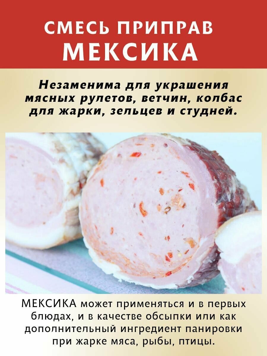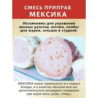 Декоративную смесь приправ "Мексика" в качестве рецептурного компонента применяют при производстве вареных колбас и паштетов. Смесь добавляют в конце процесса перемешивания. Норма внесения: 5…30 гр на 1 кг мясного сырья. При изготовлении рыбных пресервов смесь приправ рекомендуется использовать после предварительной кратковременной обработки кипятком. При производстве соусов и кетчупов, смесь приправ добавляют за 2-3 мин. до окончания процесса варки. Также смесь предназначена для декорации колбас и копченостей, для первых и вторых кулинарных блюд. Вкус жгучий, свойственный перцу чили; Запах свойственный пряностям, входящим в состав смеси.