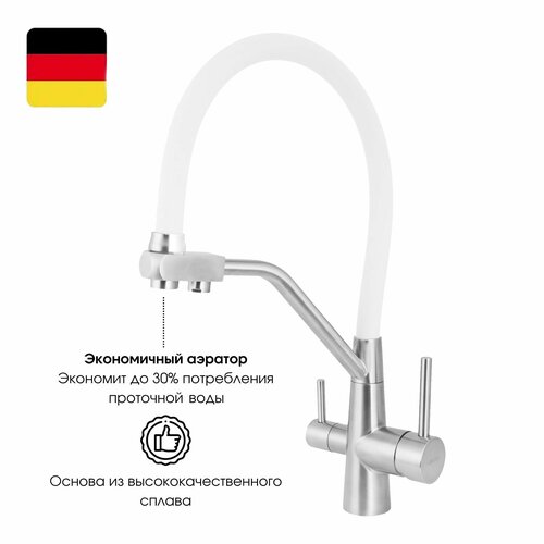 Смеситель для кухни с подключением под фильтр для питьевой воды, со съемным гибким изливом, высокий, поворотный, нержавеющая сталь, белый, сатин: сравнение цен, характеристики, фото, актуальное наличие и цены.