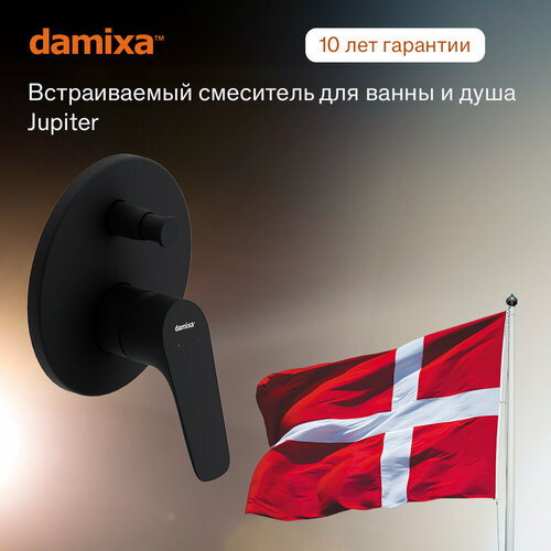 Встраиваемый смеситель для ванны и душа Damixa Jupiter. Минималистичный дизайн смесителя, монтируемого в стену, позволит грамотно использовать пространство. Его диаметр составляет всего 135 мм, поэтому это идеальное решение для небольших помещений. Встраиваемые в стену смесители сохраняют эстетику ванной комнаты благодаря тому, что все непрезентабельные части скрыты. А черный цвет придаст стиль! Плавное движение ручки обеспечивается специально разработанным картриджем Light Flow 35 мм. Точная регулировка температуры воды без резких изменений. Возможность переключения между двумя источниками. Инновационное PVD-покрытие гарантирует чрезвычайную прочность смесителя. Матово-черная поверхность не выцветает с годами и устойчива к механическим повреждениям, загрязнениям и отпечаткам пальцев. Такой смеситель прослужит вам минимум 10 лет.