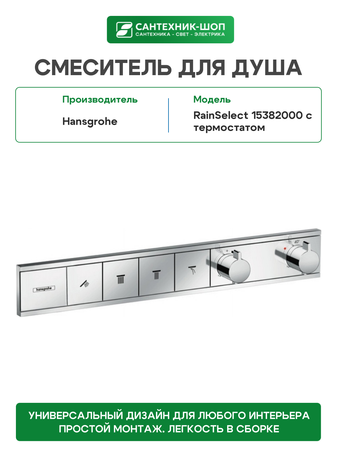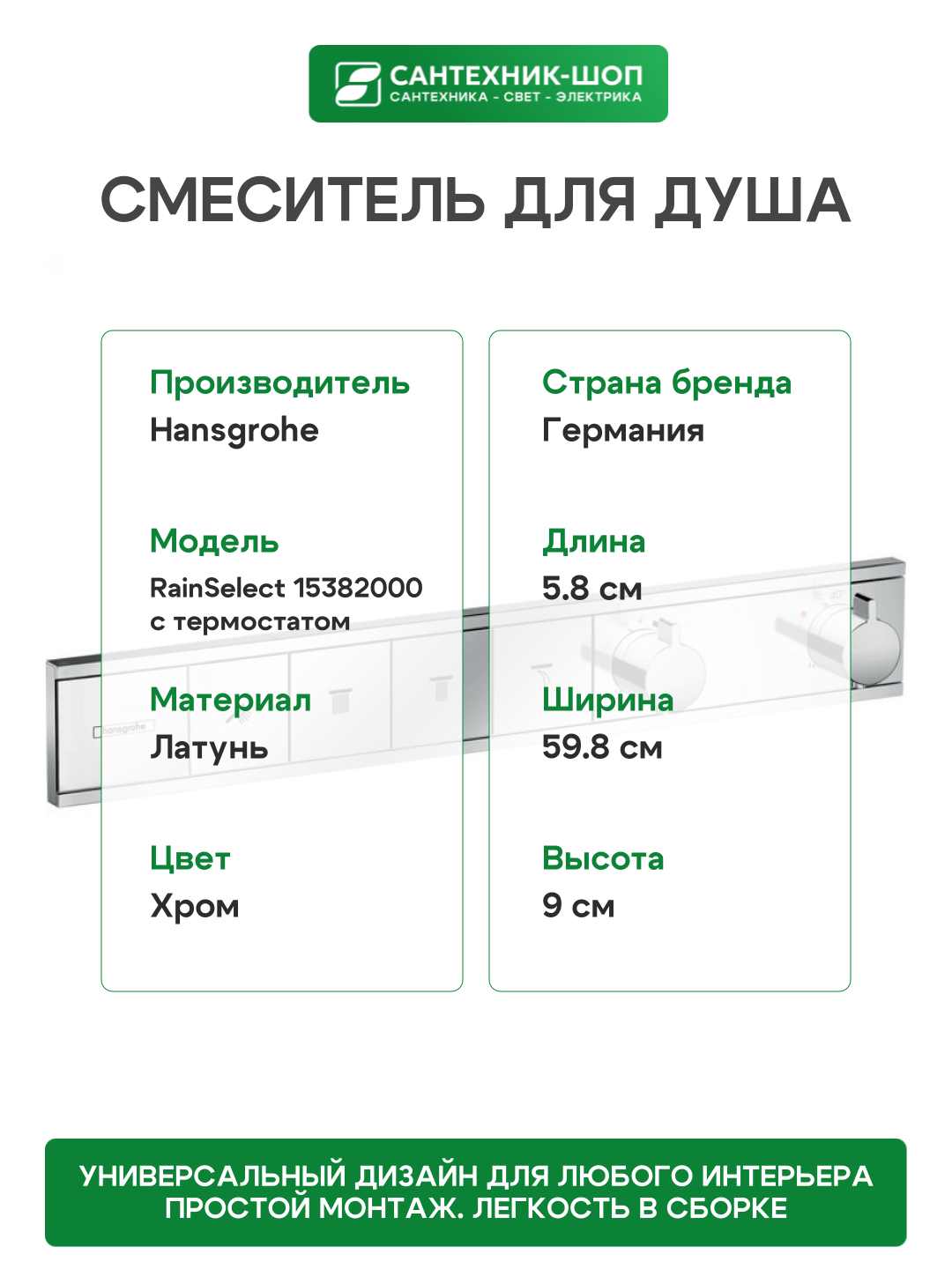 Смеситель для душа Hansgrohe RainSelect 15382000 с термостатом Хром латунь встраиваемый Германия: сравнение цен, характеристики, фото, актуальное наличие и цены.