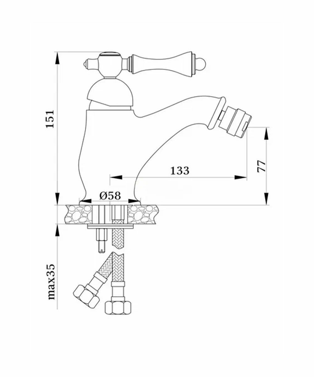 Смеситель монтируется на горизонтальную поверхность, что позволяет использовать его с различными типами биде. Монтаж осуществляется с помощью гибкой подводки и одного монтажного отверстия диаметром 35 мм.