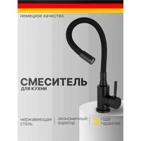 Смеситель для кухни c гибким изливом черный, кран для мойки, однорычажный, высокий, поворотный 360 градусов, матовый