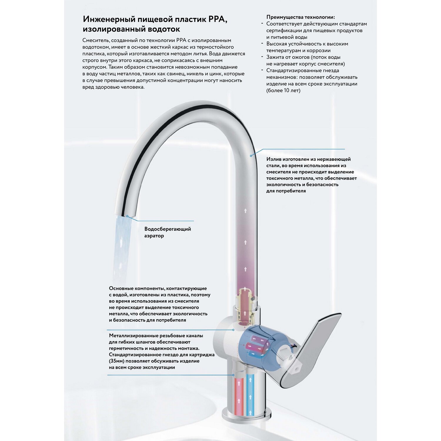 | Особенности | аэратор, поворотный излив, система быстрого монтажа |