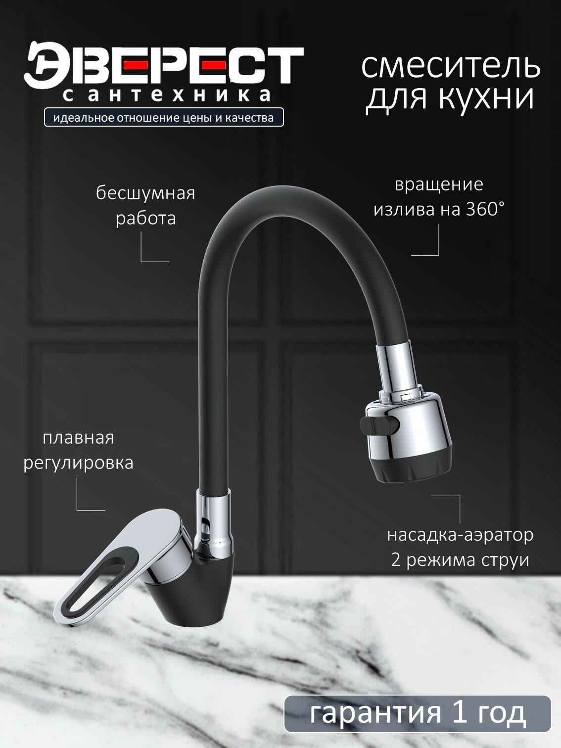 Смеситель для кухни Эверест B58-274F с гибким изливом, картридж 35 мм, чёрный, крепление гайка: сравнение цен, характеристики, фото, актуальное наличие и цены.