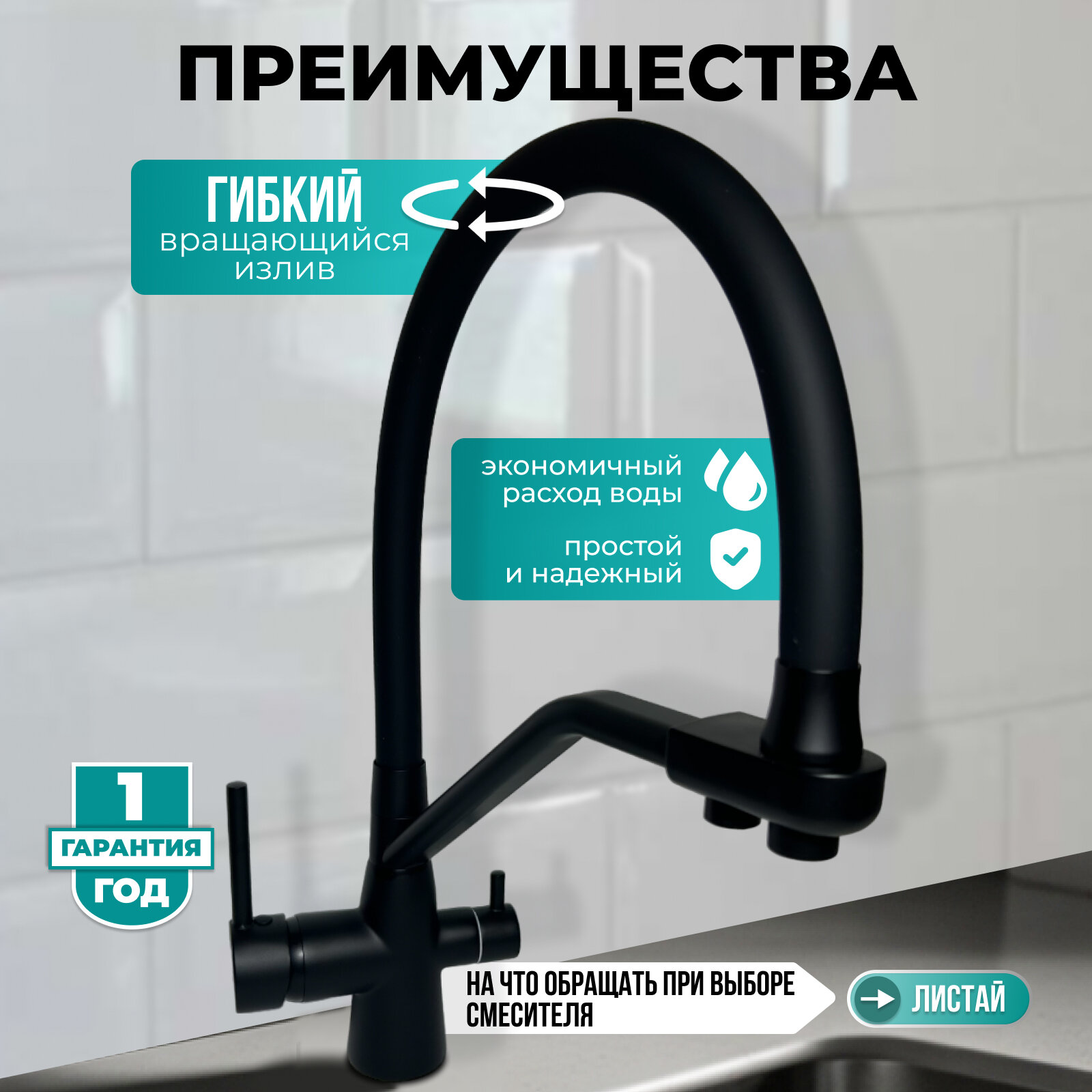 Смеситель для кухни с фильтром для питьевой воды - современное и удобное решение для вашей кухни. Гибкий смеситель на кухню изготовлен из качественной латуни. Смеситель для раковины оснащен защитой от появления коррозии. Смеситель для кухни с гибким изливом совместим с кухонной мойкой любого типа. Кухонный смеситель имеет двурычажное исполнение, два режима подачи воды. Cмеситель для кухни черный оснащен гибким изливом, высоту и глубину его выноса можно регулировать самостоятельно. Выдвижная лейка обеспечивает удобство мыть посуду нестандартных размеров. Длинный излив с высокой дугой поворачивается на 360 градусов. В качестве ежедневного ухода рекомендуем протирать кран на кухню салфеткой из микрофибры. Наш смеситель на кухню для раковины отвечает всем требованиям современной сантехники. Приобретайте кран для кухни черный и делитесь отзывами! Для покупки доступны цвета: кран для кухни с фильтром черный; серый матовый, серебро, хром. Мы предоставляем гарантию на товар (в случае необходимости открывайте чат с продавцом). Сервисный центр находится в России, решение вопросов по гарантии 1года*.