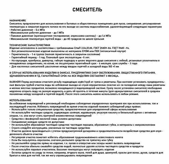паспорт, корпус с изливом, подводка 1/2, крепеж, набор прокладок.