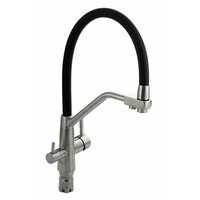 Смеситель для кухонной мойки и раковин с двойным выпуском воды для фильтра, литой матовый корпус, из нержавеющей стали марка 304, с высоким С-образным гибким изливом чёрного цвета с фиксацией на жёстком изливе, шаровый.