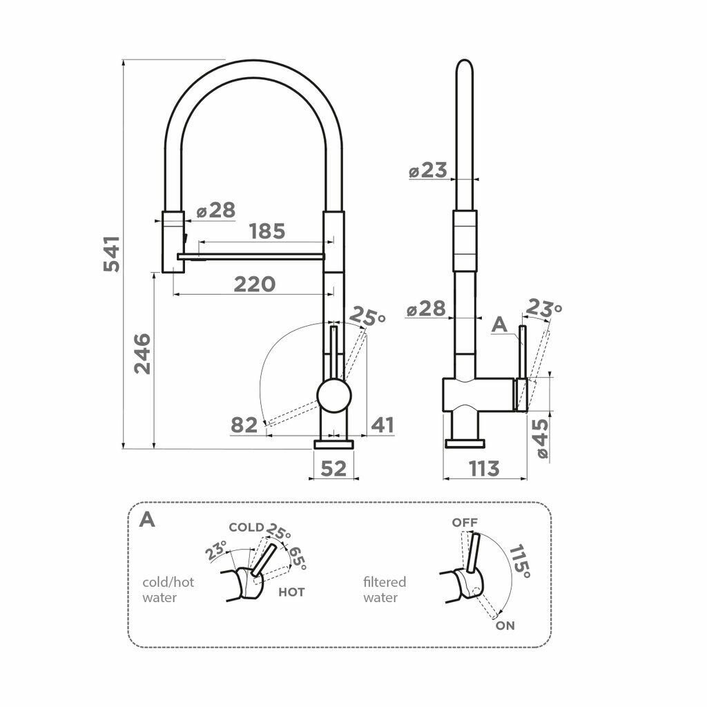 Функциональная опция смесителя: возможность подключения фильтрованной воды благодаря технологии PURE LIFE®. Очищенная вода подается по отдельной трубке и не смешивается с водопроводной. Kanto имеет рычаг включения водопроводной воды с открытием в 20 градусов (назад) и 70 градусов (вперёд), что позволяет установить смеситель близко к стене без ограничения.