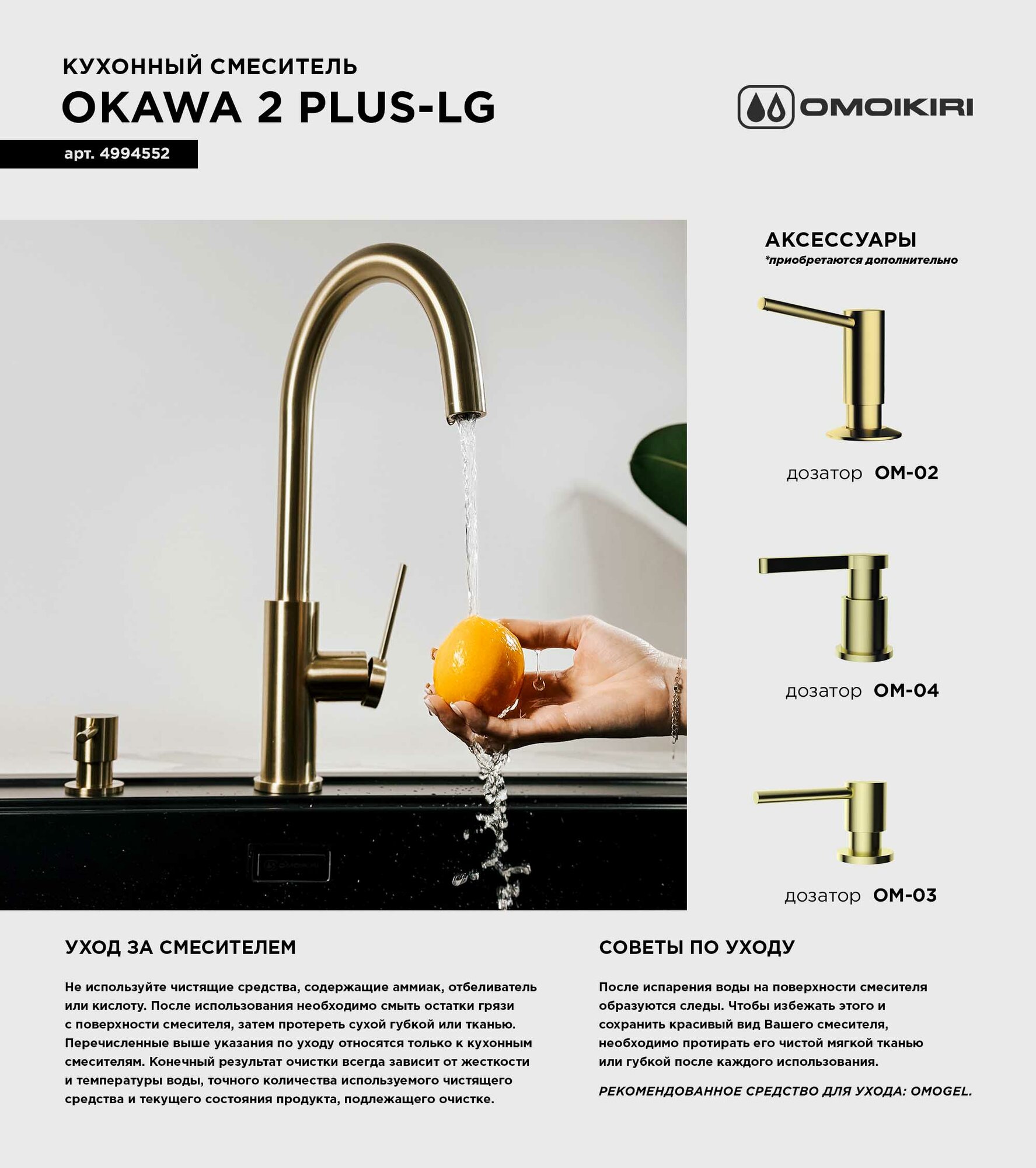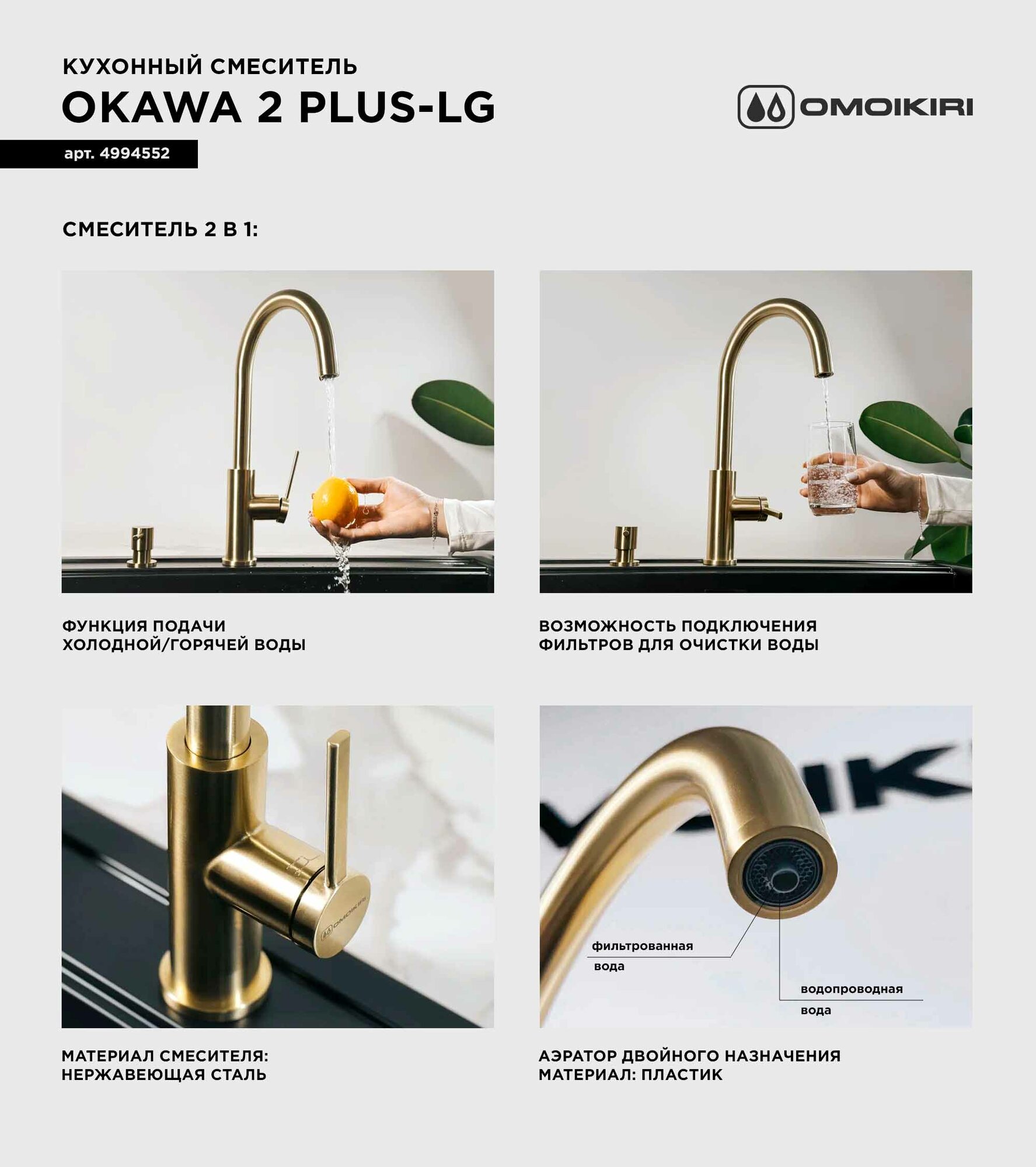 Смеситель для кухни OMOIKIRI Okawa 2 Plus-LG из нержавеющей стали с подключением фильтра/светлое золото: сравнение цен, характеристики, фото, актуальное наличие и цены.