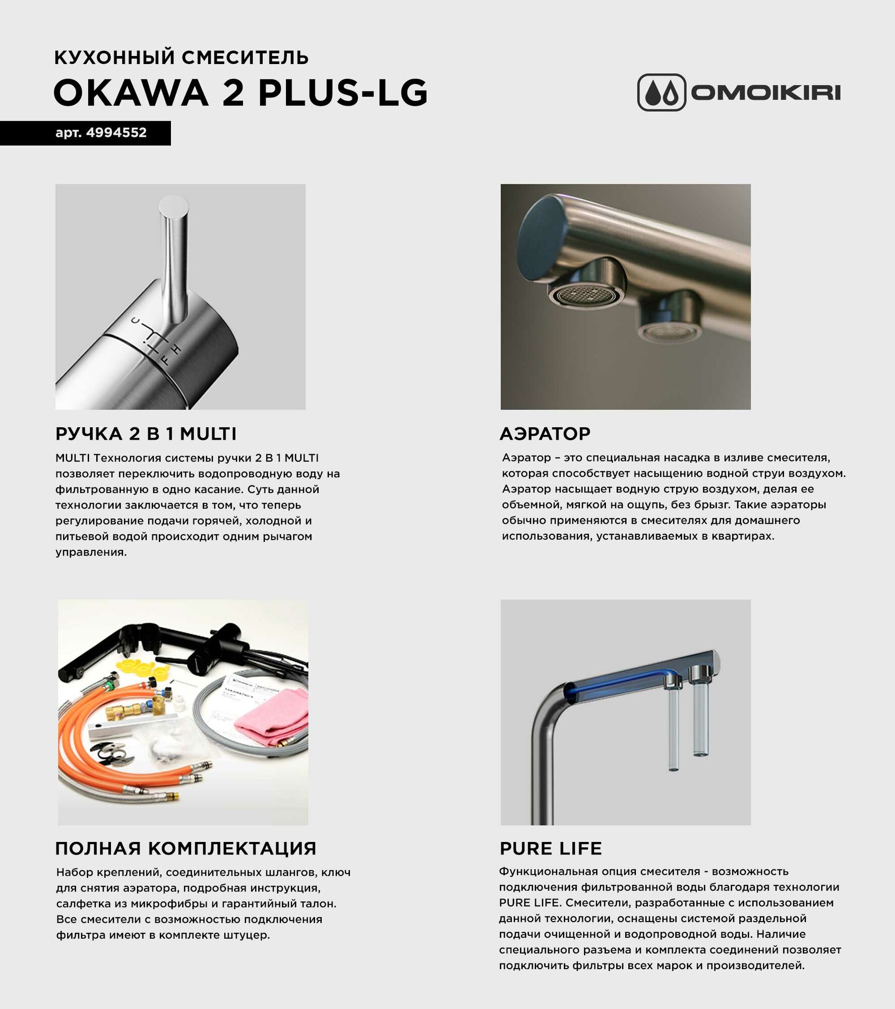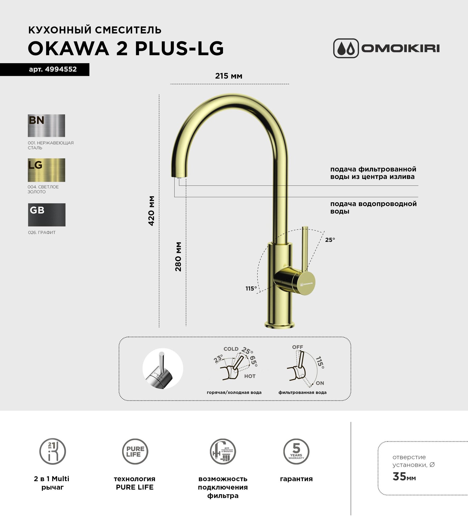 Купить Смеситель для кухни OMOIKIRI Okawa 2 Plus-LG из нержавеющей стали с подключением фильтра/светлое золото с доставкой по всей России.