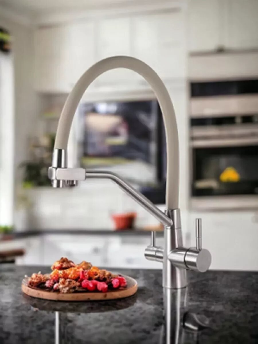 Смеситель для кухни (мойки) с гибким бежевым изливом и фильтром, хром, нержавейка T603S-6: сравнение цен, характеристики, фото, актуальное наличие и цены.