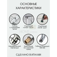 | Комплектация | Смеситель, гибкая подводка 500 мм., комплект подключения; паспорт |