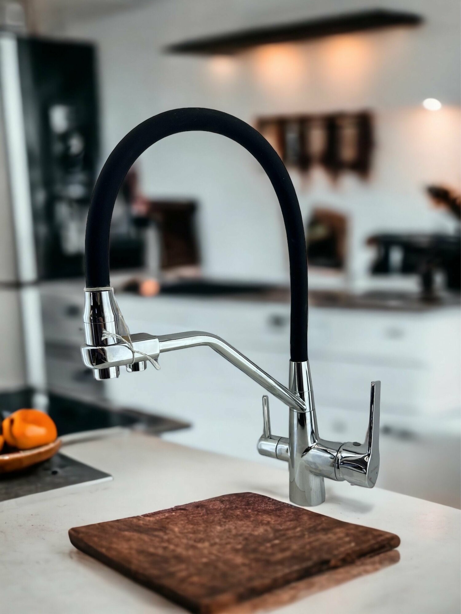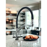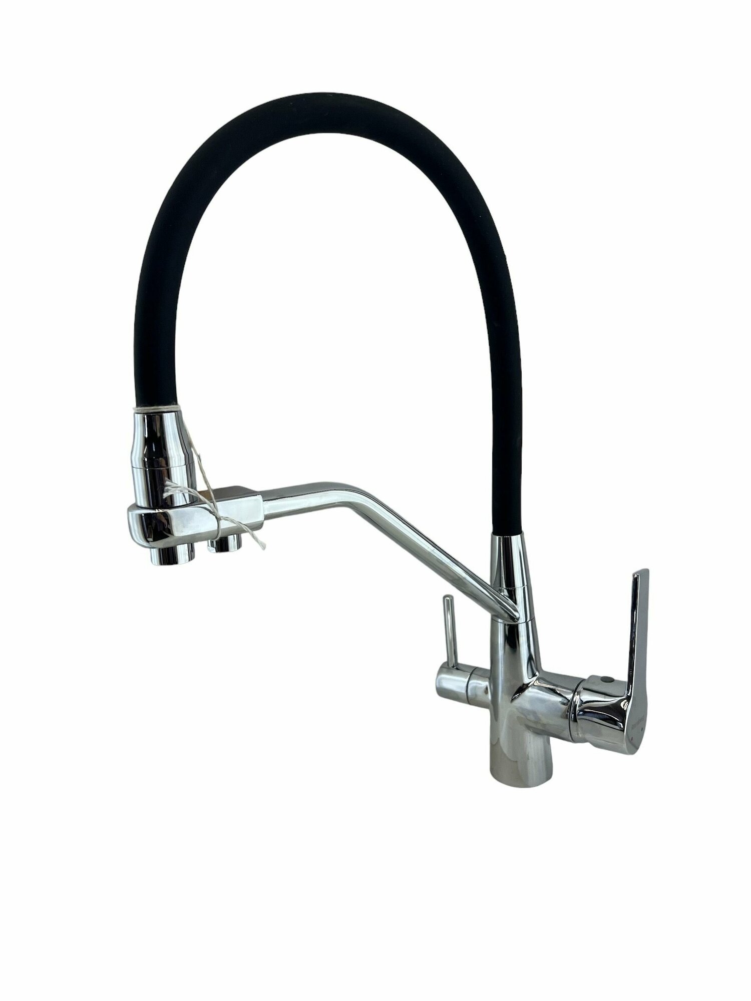 Купить Смеситель для кухни Rainsberg корпус цвета хром с силиконовым гибким черным изливом, однорычажный, с отдельным выходом под фильтр. Цвет: хром с черным изливом с доставкой по всей России.